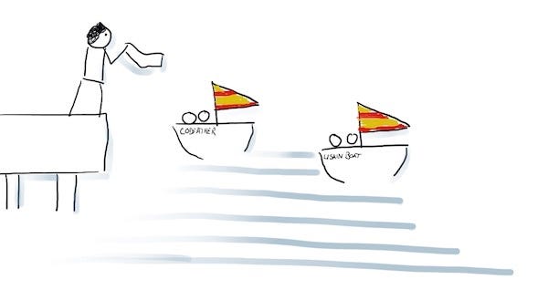 Each boat has a crew of 2–5 people. Each boat has a clear mission and a clear definition of done. You can only be in one boat and have to stay for the duration of the trip. There will be radio communication, there will be help and support, but the crew on a boat are responsible for completing the mission. There is a naval control that focuses on where the boats are, removing obstacles so that the mission is easier to complete. People that participate in the naval control are not in a boat.